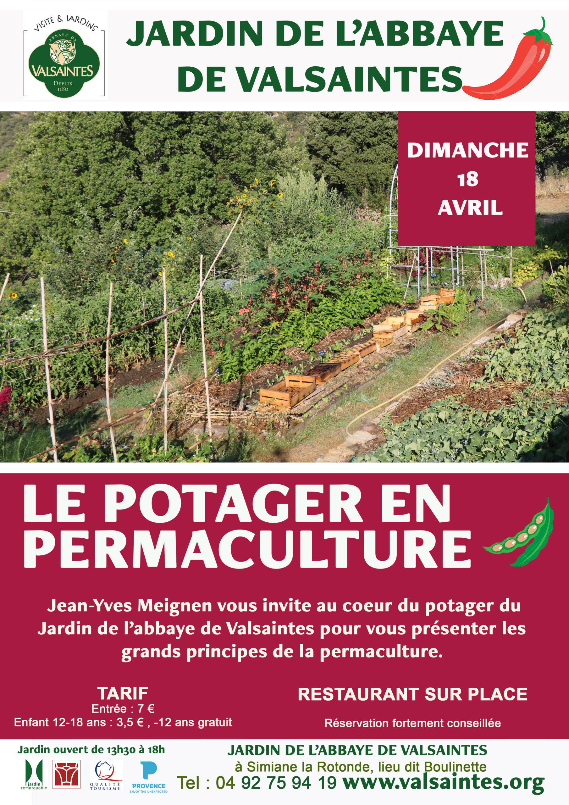 Jean-Yves Meignen vous invite au coeur du potager du Jardin de l’abbaye de Valsaintes pour vous présenter les grands principes de la permaculture. Animations comprises dans le tarif d'entrée au jardin : 7€ / 3,5€ Possibilité de repas au restaurant sur réservation |